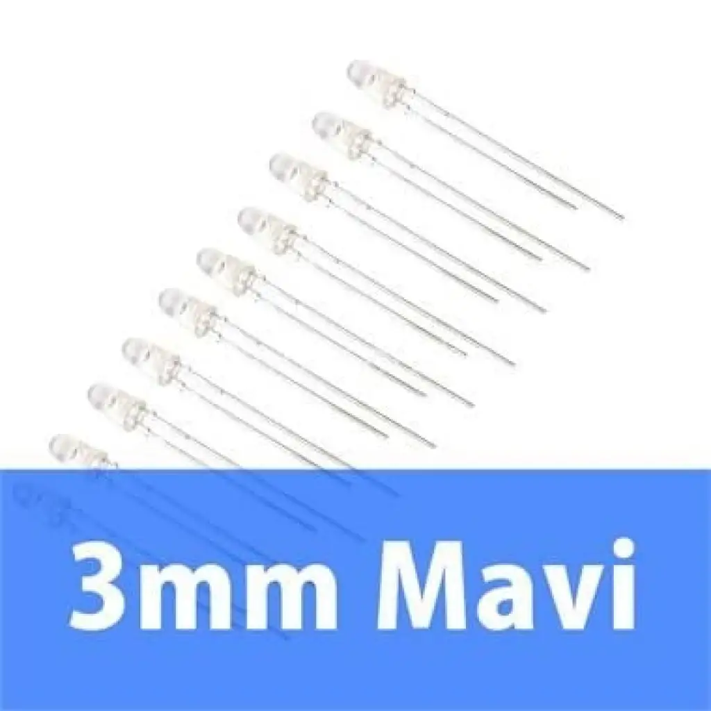 3mm şeffaf mavi diyot LED("Light Emitting Diode", Işık Yayan Diyot), elektronik devrelerde sıklıkla kullanılan bir devre elemanıdır. Renk ve boyutuna göre 1.6-4V arasındaki gerilim ile çalışır. Bu gerilim değerlerinin üstünde çalıştırıldığında led diyota düşük dirençli seri direnç bağlanmalıdır.
