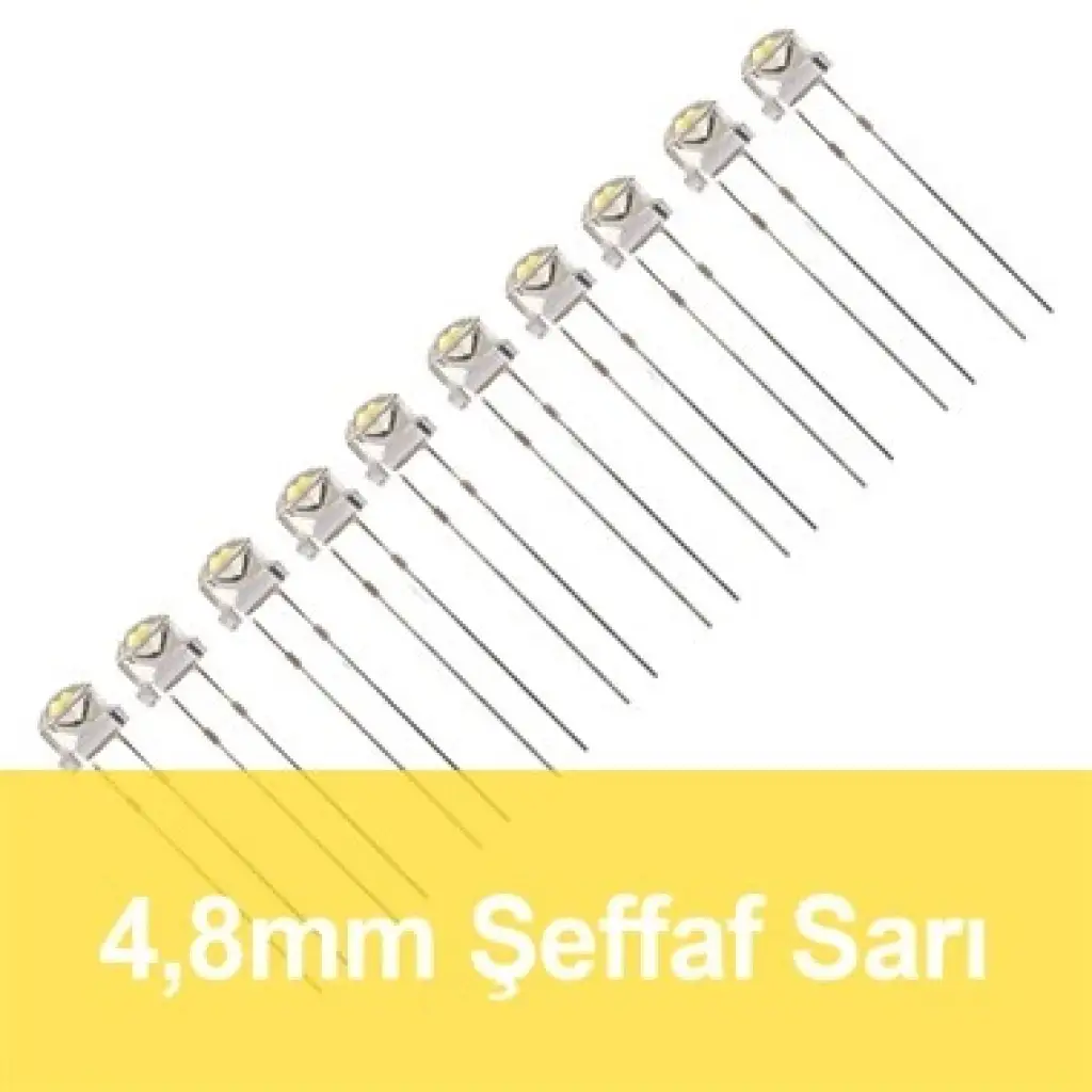 4.8mm şeffaf sarı mantar LED("Light Emitting Diode", Işık Yayan Diyot), elektronik devrelerde sıklıkla kullanılan bir devre elemanıdır. Renk ve boyutuna göre 1.6-4V arasındaki gerilim ile çalışır. Bu gerilim değerlerinin üstünde çalıştırıldığında led diyota düşük dirençli seri direnç bağlanmalıdır.