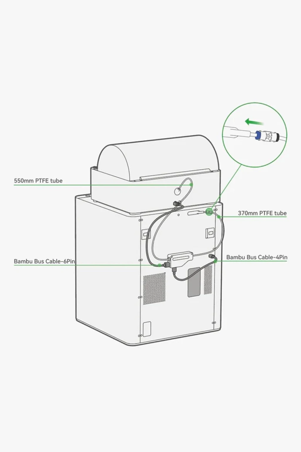 • Filament tamponu, tek bir AMS ünitesiyle birlikte gerekli olan bir aksesuardır. İşlevi, filament için bir tamponlama etkisi sağlamaktır. Arayüz, 3 mm aralıklı, geçmeli terminal girişli 4 pimli kablo, 3 mm aralıklı, geçmeli terminal çıkışlı 6 pimli kablodur.