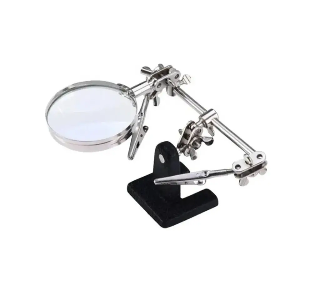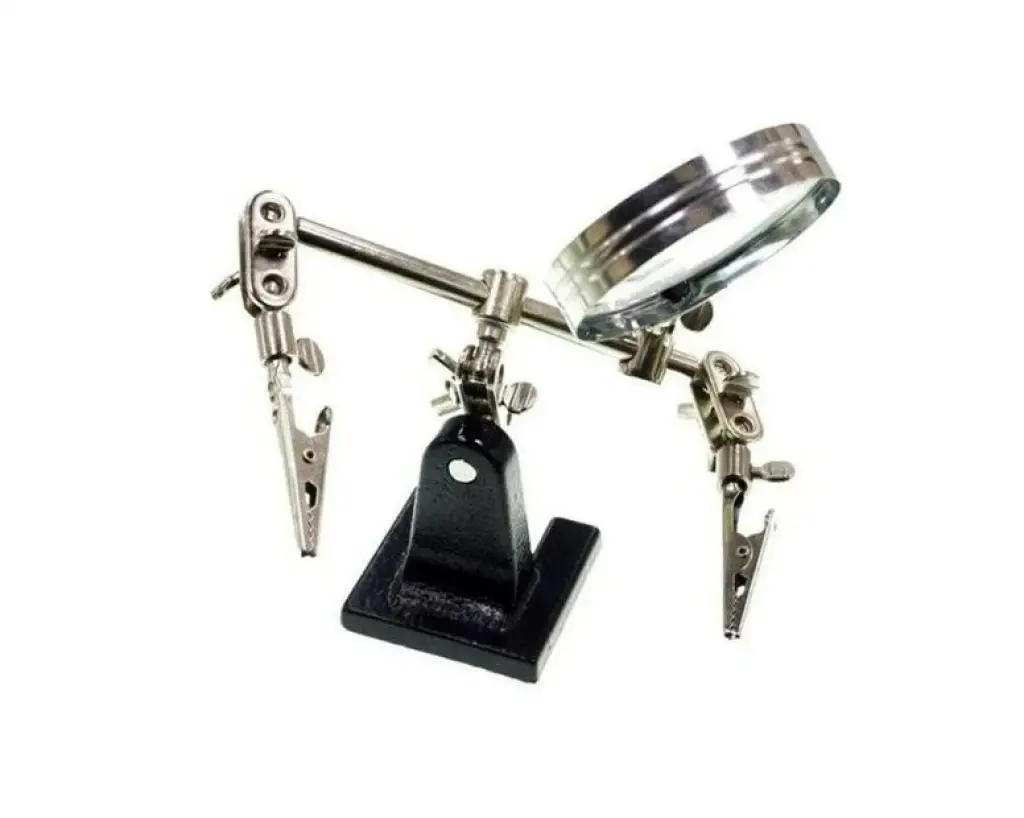 Bu yardımcı aparat, elektronik devrelerle çalışırken size ekstra bir çift el sağlar. Ayarlanabilir mandalları sayesinde devre kartlarını, kabloları veya küçük parçaları sabitleyerek, lehimleme veya hassas montaj işlemlerini çok daha kolay hâle getirir. Üst kısmındaki büyüteç ile küçük ayrıntıları net bir şekilde görmenizi sağlar ve göz yorgunluğunu azaltır.