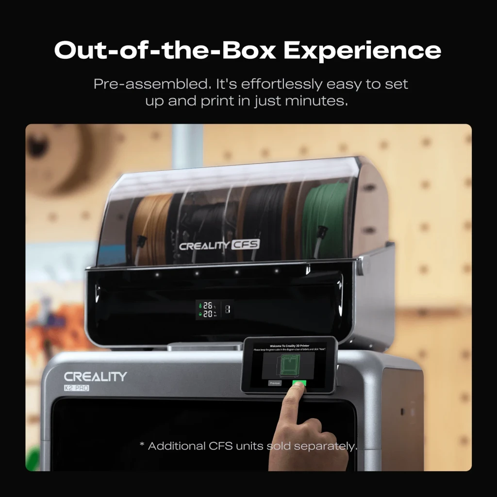 • Çok renkli baskı ve CFS sistemi: CFS ünitesi, dört makaraya kadar filament alır ve otomatik filament besleme, RFID ile filament tanıma ve nemden koruma özellikleri sunar. K2 Pro Combo’da bir CFS ünitesi standart olarak bulunur; ayrıca dört adede kadar CFS eklenerek tek baskıda 16 renge kadar çıkmak mümkündür. CFS’nin otomatik besleme ve çok renkli dilimleme yeteneği sayesinde renk değiştirme işlemleri sorunsuz ve verimli hale gelir.