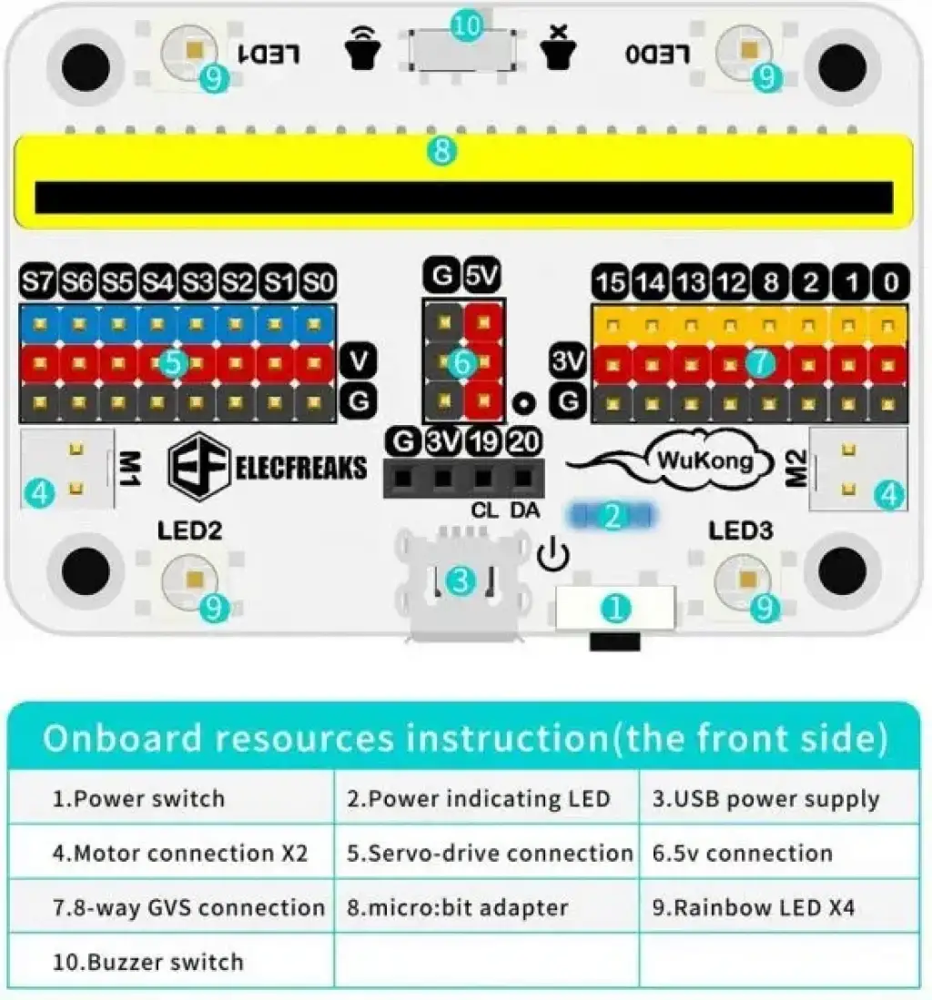 Wukong, mikro:bit tabanlı çoklu fonksiyonlara sahip, üzerinde buzzer, servo ve motor sürücüleri bulunan mikro:bit ile benzer boyuta sahip entegre bir breakout kartıdır. Dahili 400mAh Li-ion pil paketi ve yerleşik güç kontrol sistemi ile, bir seferde 40 dakikadan fazla çalışabilen tam dolum için sadece 20 dakika ile hızlı şarjı destekler.
