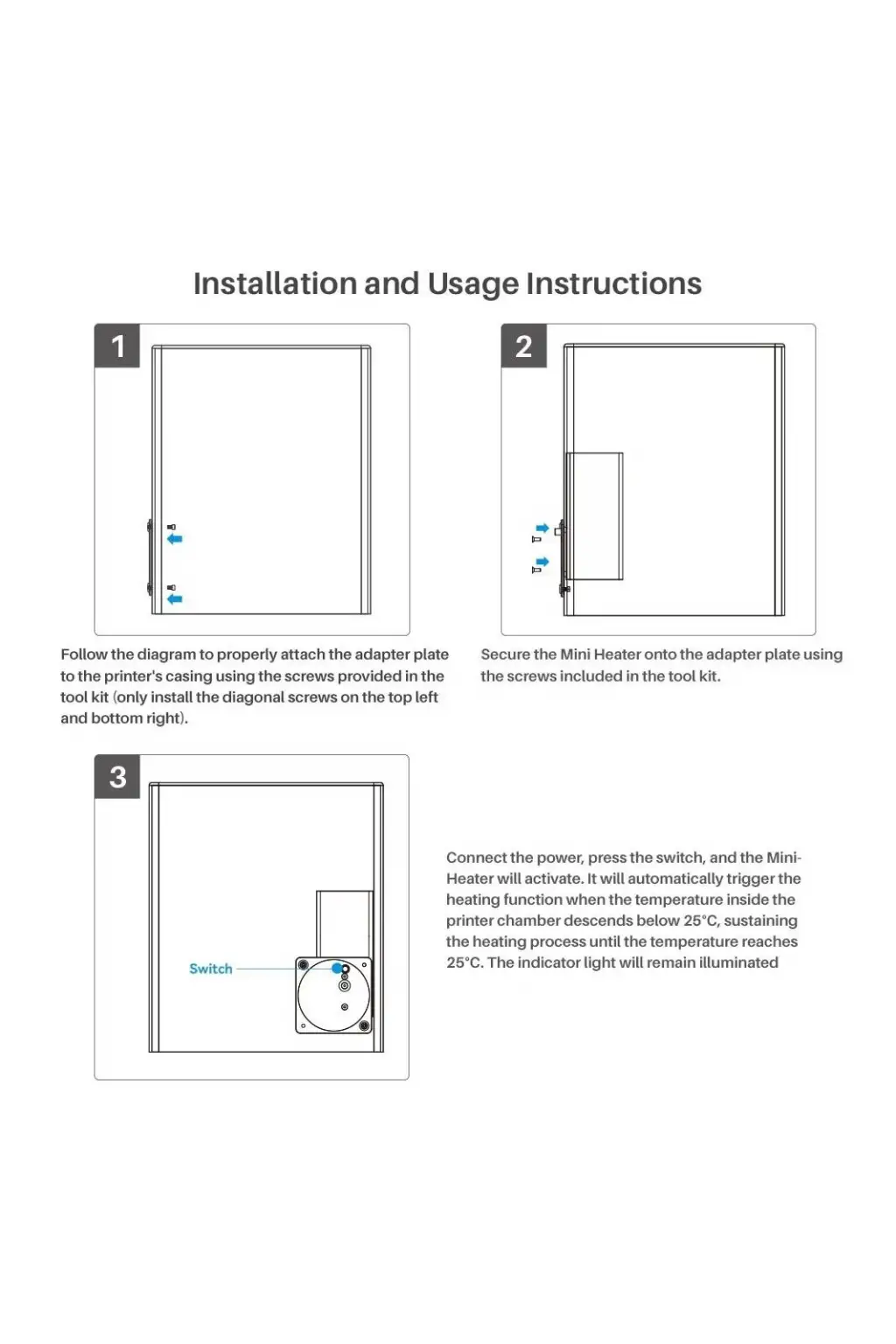 Mini Isıtıcı, kutudan çıkarmadan ilk şaheserinizi yazdırmaya kadar kusursuz ve keyifli bir deneyim sağlayan kullanıcı dostu bir tasarıma sahiptir. Basit kurulum süreciyle, kolayca kurabilir ve baskı yolculuğunuza güvenle başlayabilirsiniz.