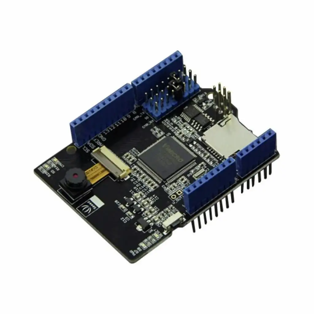 Arduino Camera ShieldArduino camera shield fotoğraf çekme özelliği olan bir arduino modülüdür. Arduino platformu olarak bakıldığında bu alandaki ilk shield olarak karşımıza çıkmaktadır. Ürün görüntü gücünü VC076 protokolünü destekleyen OV7725 yüksek performanslı kamera entegresinden almaktadır. VGA kalitesinde fotoğraf çekmesine rağmen görüntü işleme yapılabilmektedir.