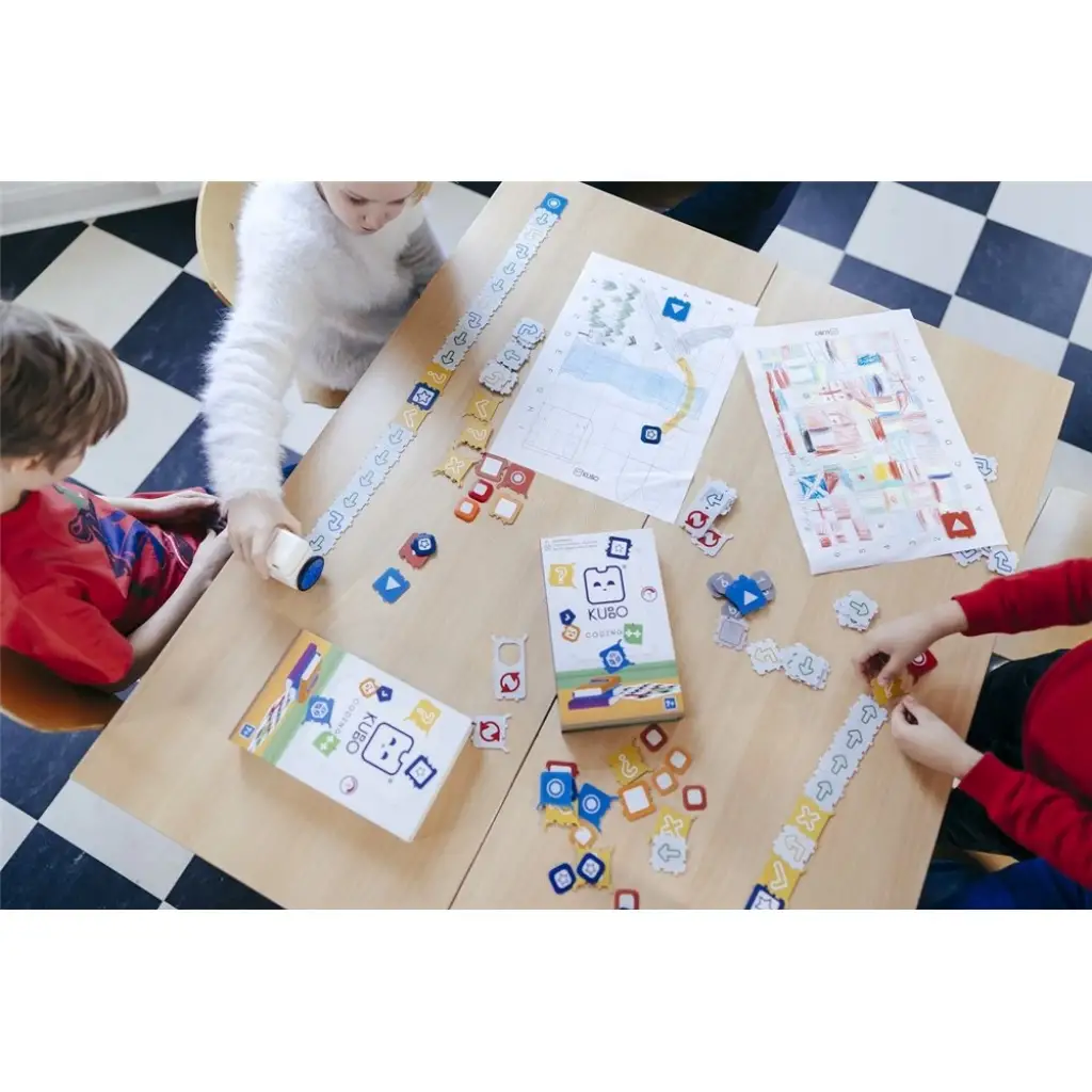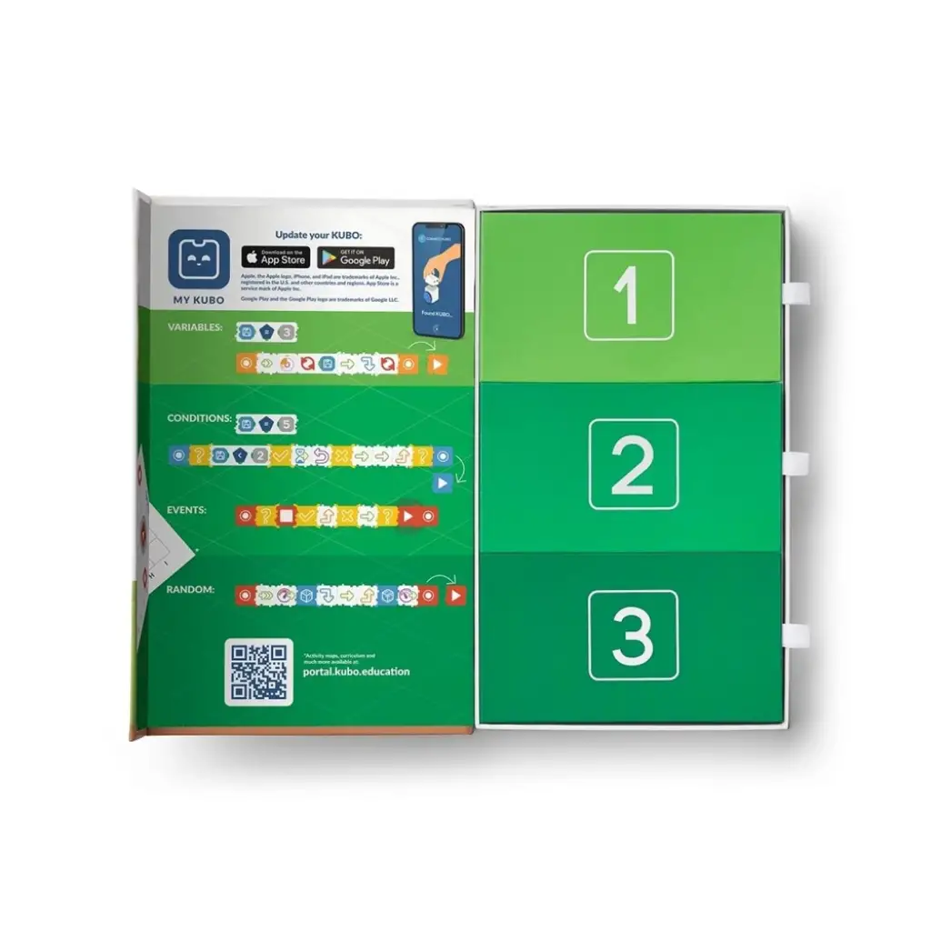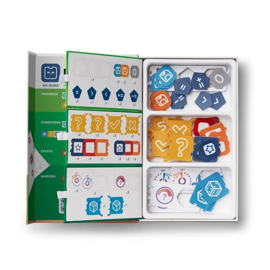 KUBO Coding++ Seti, kodlamanın tüm temel kavramlarını benzersiz bir el becerisi ve ekran olmadan sunma amacıyla seriyi tamamlar. Bulmaca gibi bir yapıya sahip olan bu set, öğrencilerin karmaşık algoritmalarla çalışmasını ve soyut düşünme becerilerini geliştirmesini kolaylaştırır. Set; etkinlik planları, bir proje paketi ve öğretmen kılavuzları ile birlikte 44 kod kartı içerir. Bu kod kartları; etkinlikleri, koşulları (if/else/eğer/değilse) ve değişkenleri ele alır.