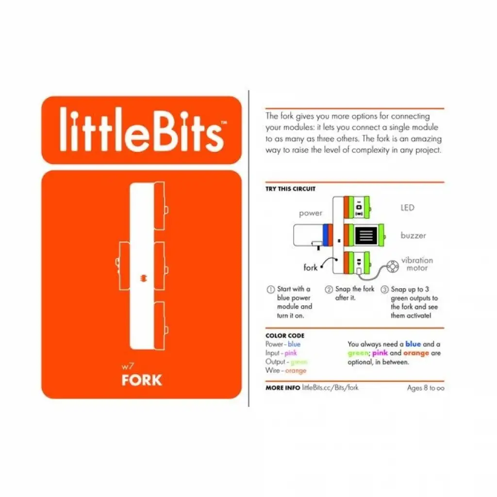 • LittleBits FG Fork W7 (Çoklayıcı Bit), tek bir sinyali birden fazla modüle dağıtarak projelerinizi genişletmenizi sağlayan bir modüldür. LittleBits sistemleri ile uyumlu yapısı sayesinde daha kompleks ve fonksiyonel projeler oluşturabilirsiniz.