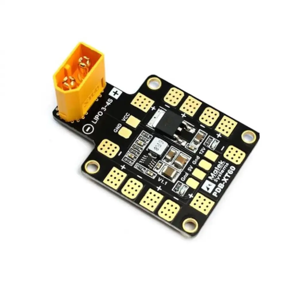 Bu Güç Dağıtım Panosu, 36x50mm, 4 katmanlı bir PCB'de mümkün olan en yüksek performans ve güvenilirliği sağlayacak şekilde tasarlanmıştır. LiPo pillere kolay bağlantı için bir XT60 ile birlikte gelir.