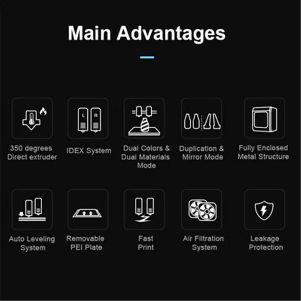 Mingda MD-400D IDEX 3D Printer etkileyici özellikleri üzerinde toplamış seri üretim ve ileri plastik prototipleme için kullanılabilecek gelişmiş bir 3B yazıcıdır. Küçük işletmeler için hızlı 3B baskı imkanı sunan bu ürün 2 renk ve 2 farklı malzeme (IDEX - Independent Dual Extruder) ile aynı anda bağımsız olarak çalışma seçeneği getirdiğinden kompleks prototipleri sorunsuzca modelleyebilirsiniz