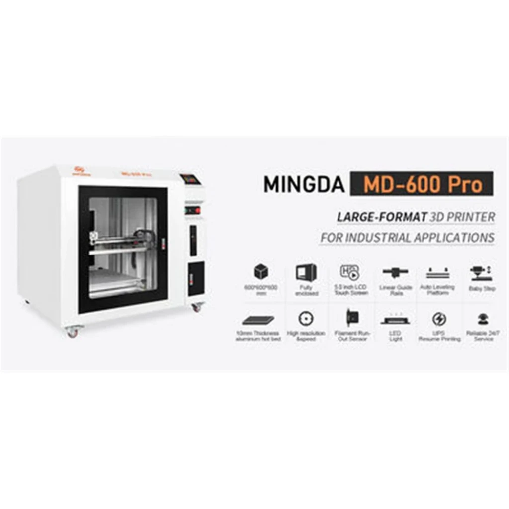 MD-600 Pro, standart masaüstü 3D yazıcıların 10 katı ( 600 * 600 * 600 mm) olacak şekilde büyük bir basım hacmine sahiptir. Tamamen kapalı bir baskı odası ve sıcaklık kontrollü filament haznesine sahip olan ve hızlı ısınma performansına sahip MD-600 Pro, gelişmiş malzemelerle inanılmaz sonuçlar üretir.