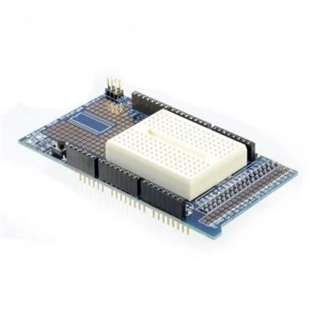 Arduino Mega Proto ShieldArduino Mega 2560 Proto shield Mini Breadboard'lu kit, ile projelerinizi kolayca kurabileceğiniz bir üründür. Ürün mini breadboard ile birlikte gelmektedir. Breadboard ile kurduğunuz devrenizi kolayca Proto Shield üzerindeki alanlara takarak kendi özel modülünüzü oluşturabilirsiniz. Mega 2560 1280 Protoshield Arduino üzerine projenizi oluşturmak için parçaları prototipleme alanına lehim yapmak zorunda kalmadan entegre bacakları ve header iletken ayaklarını hızlı bir şekilde lehimsiz kullanabilirsiniz. Tüm Arduino I / O pinleri için ve lehimsiz yüzey montajlı entegre devrelere uygun ekstra bağlantılar kart üzerinde mevcuttur. Hem DIP hem de SMD devre elemanları için lehimlenebilir kısımları bulunan Shield'i isterseniz lehim yaparak da Breadboard ile kullanabilirsiniz.