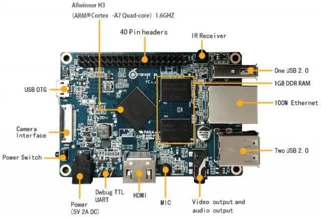 Orange Pi One; Android 4.4, Ubuntu, Debian ve Raspbian işletim sistemlerini destekleyen, Orange Pi serisinin en uygun fiyatlı ve en küçük boyutlu mini bilgisayarıdır. AllWinner H3 SoC ve 1GB RAM belleğe sahiptir. Uygun fiyatı ve küçük boyutu sayesinde gömülü sistem projeleriniz için mükemmel bir seçimdir.