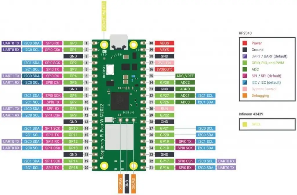 Ana çip, Raspberry Pi tarafından yapılan RP2040'tır (ilk şirket içi mikro denetleyici çipi!) ve 133MHz'e kadar çalışan esnek bir saate sahip çift çekirdekli bir ARM Cortex M0+ işlemcidir. WiFi ve Bluetooth, bir Infineon CYW43439 kullanılarak etkinleştirilir.