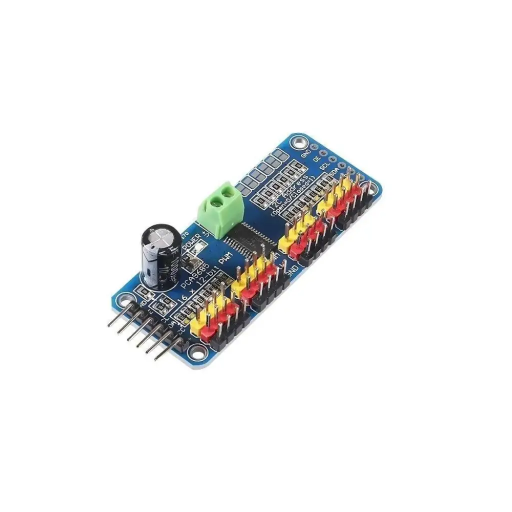 PCA9685, 16 kanallı ve 12 bit çözünürlüklü bir PWM sürücü kartıdır. Servo motorlar, LED’ler ve diğer PWM kontrollü cihazları hassas bir şekilde kontrol etmek için tasarlanmıştır. I²C (TWI) iletişim protokolü ile çalışır ve aynı hat üzerinde birden fazla kart zincirleme olarak bağlanabilir.