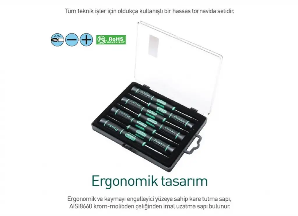 Tüm teknik işler için oldukça kullanışlı bir hassas tornavida setidir. AISI8660 krom-molibden çeliğinden imal edilmiştir .Kaymayı engelleyen ayarlı özel sap mevcuttur.