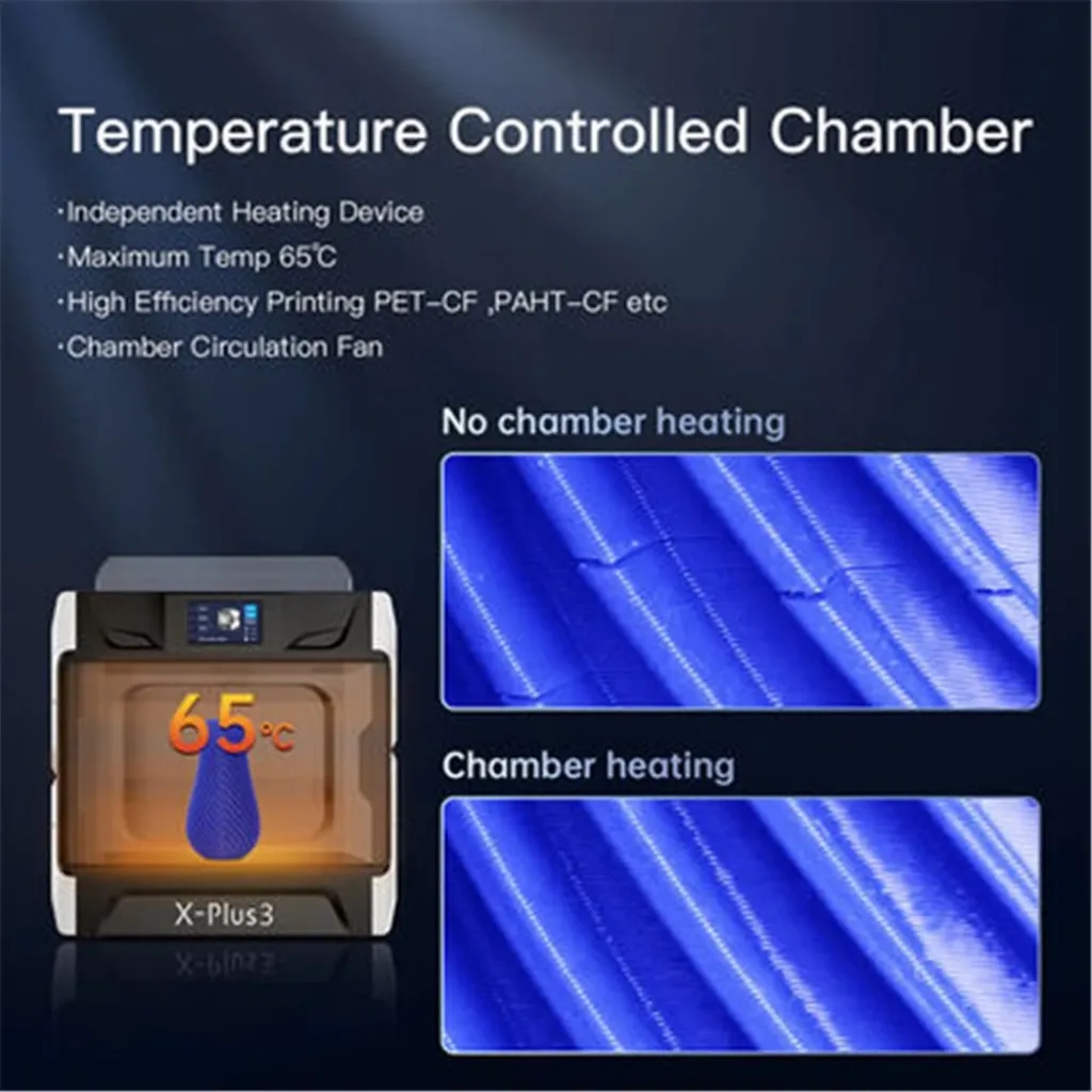 X-Plus 3, önceden monte edilmiştir, kutusundan çıkarıldıktan sonra 10 dakika içinde kullanıma hazır hale gelir. X-Plus 3 üç boyutlu yazıcı, tamamen kapalı baskı kabinine sahiptir ve bu kabin 65 °C e kadar ısınabilir; yüksek performanslı termoplastiklerle güvenilir baskılar sunar. Kabin, daha iyi baskı sonuçları ve güvenli bir ortam için sirkülasyon fanı ile donatılmıştır.