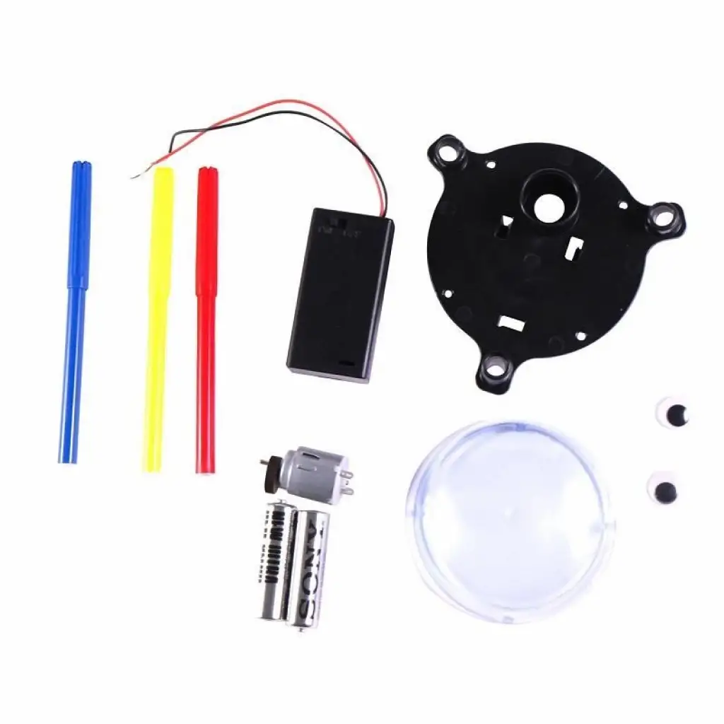 Rebot gövdesi, şeffaf oval kapak, titreşim motoru, anahtarlı pil yuvası, 2 adet 1,5V AA Pil, 3 adet keçeli kalem, montaj kılavuzu, 2 adet oynar göz.