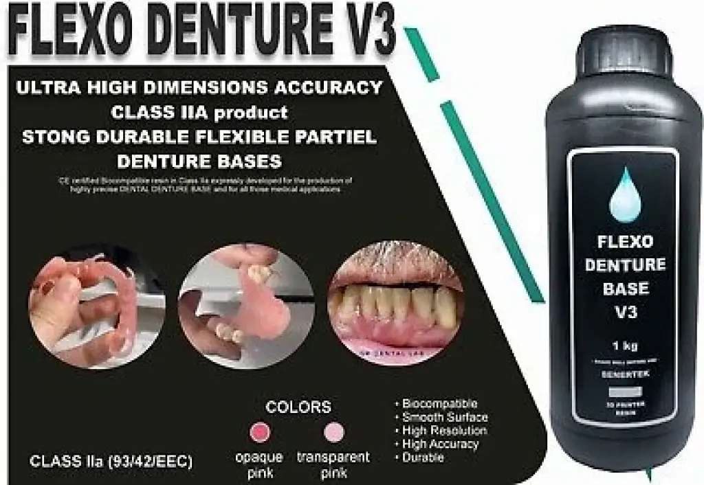 SENERTEK FLEXO DENTURE BASE 3D baskı reçinesi, esnek partel protez tabanı üretimi için nano seramik içerikli biyouyumlu bir reçinedir. DLP, SLA ve LCD 3D yazıcılar için uygundur. CE sertifikalıdır Tıbbi Sınıfı IIA’dır.