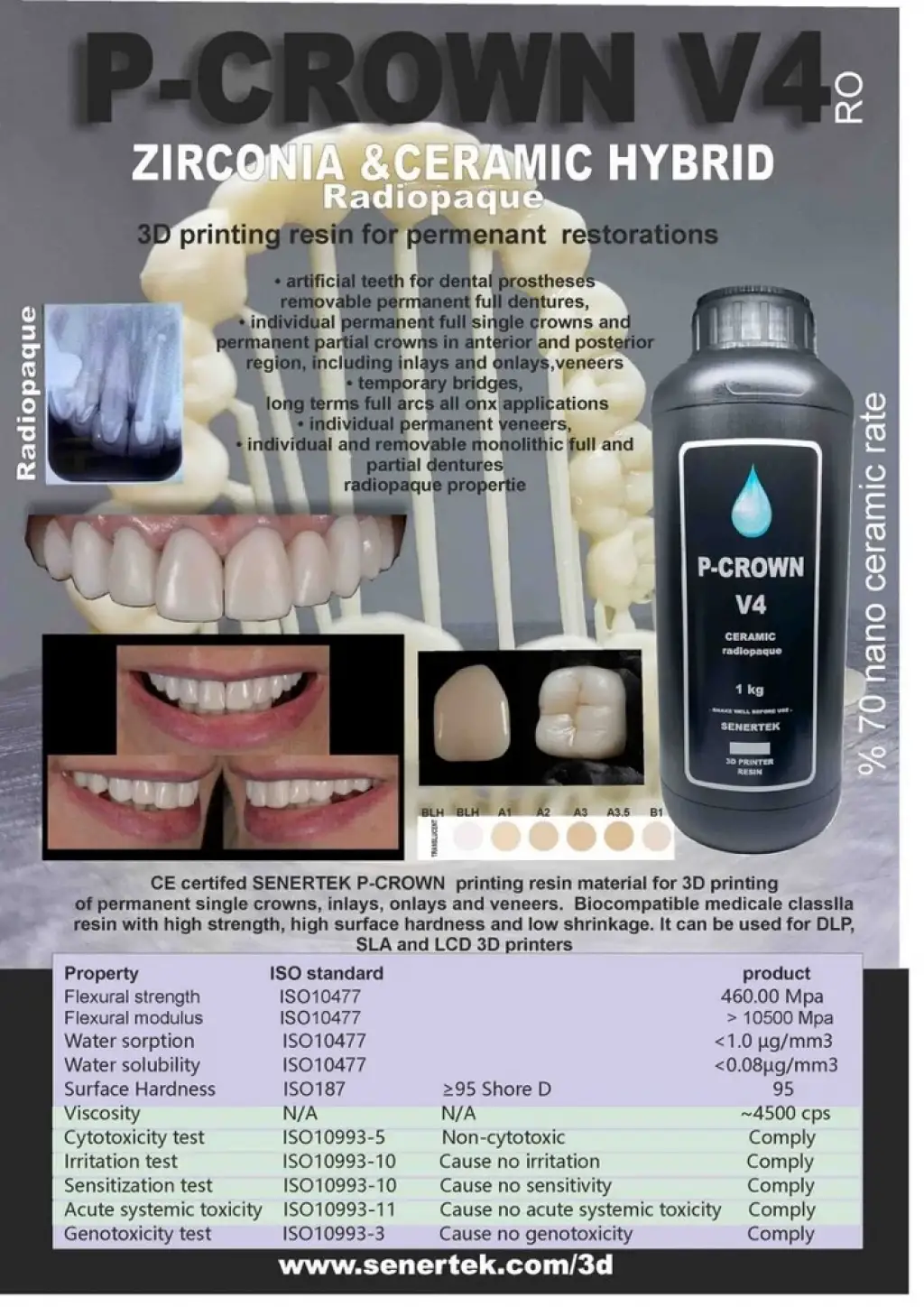 Senertek bio-uyumlu, yarı esnek, sağlam, sıfır su çekme faktörlü, UV Glass uygulamaya gerek olmayan, zaman içerisinde hasta ağzında renk değiştirmeyen dental kalıcı kron reçine.