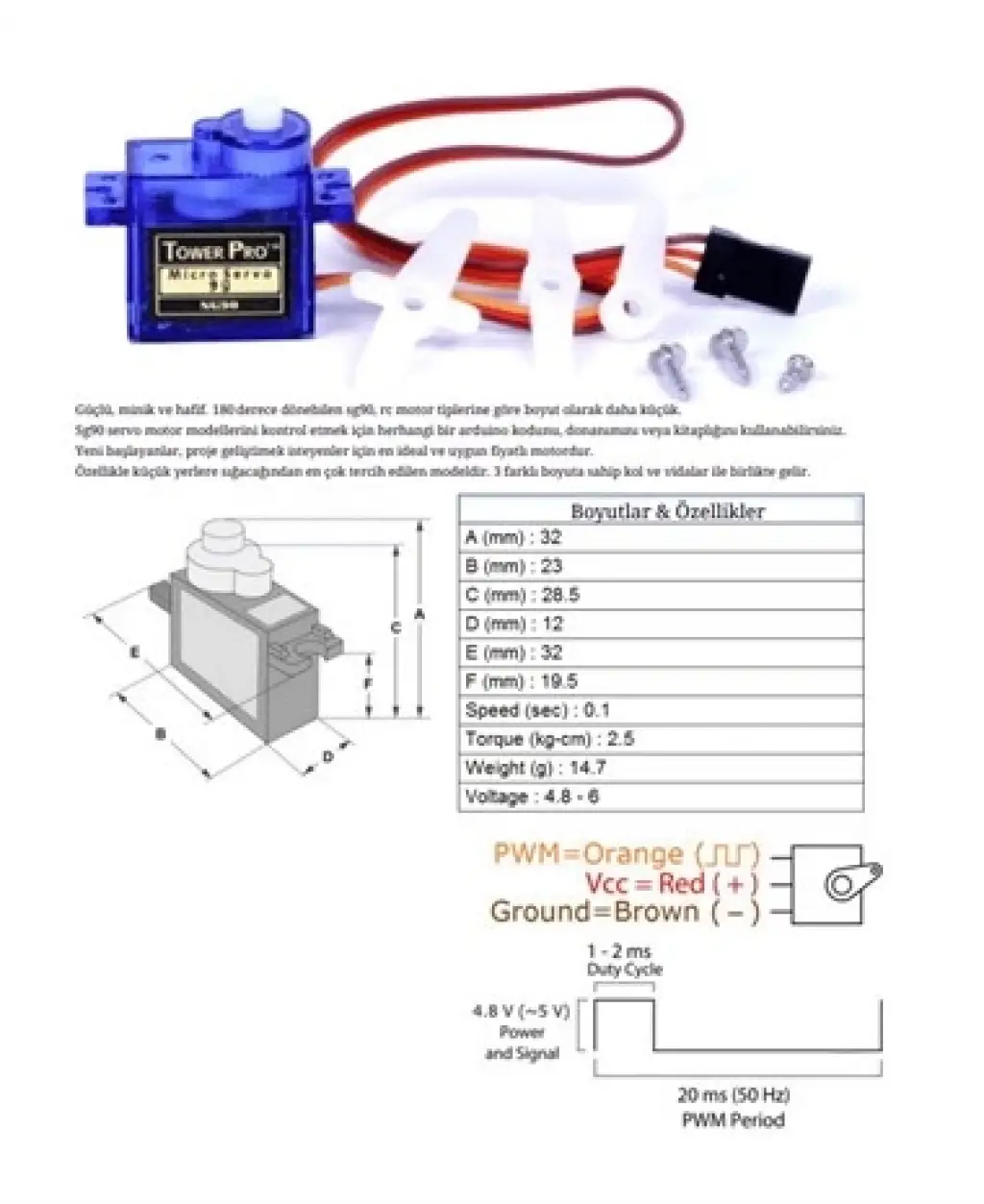 NOT:SG90 servo motor dişli kutusu plastiktir. Servo başlıkları ve diğer parçaları ile birlikte gönderilir. Diğer hobi servolarında olduğu gibi motor milinin elle sağa sola çevrilmesiyle dişlileri kırılabilir, motora bu tarz el ile müdahaleden kaçınılmalıdır.