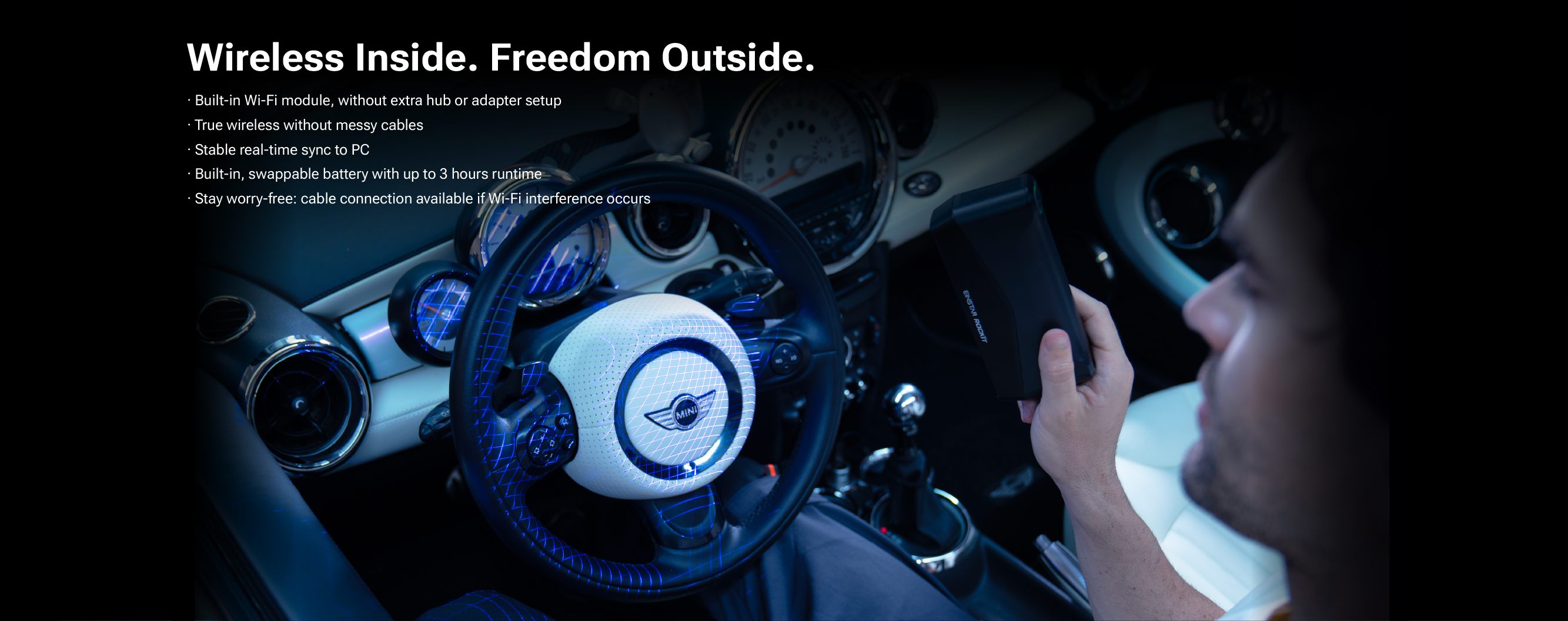 EINSTAR Rockit, taşıması kolay ve kullanımı basit, güvenilir bir 3D tarayıcıya ihtiyaç duyanlar için tasarlanmıştır. Sadece 425 gram ağırlığındaki cihaz, tek elle rahatça taşınabilir veya cebinize sığar, ancak hassas ve tutarlı sonuçlar sunar. Dahili Wi-Fi ve değiştirilebilir pil, kablolara veya hub'lara bağlı kalmadan üç saate kadar özgürce tarama yapmanızı sağlar. İster masada, ister atölyede veya dışarıda çalışın, Rockit günlük rutininize uyum sağlar.