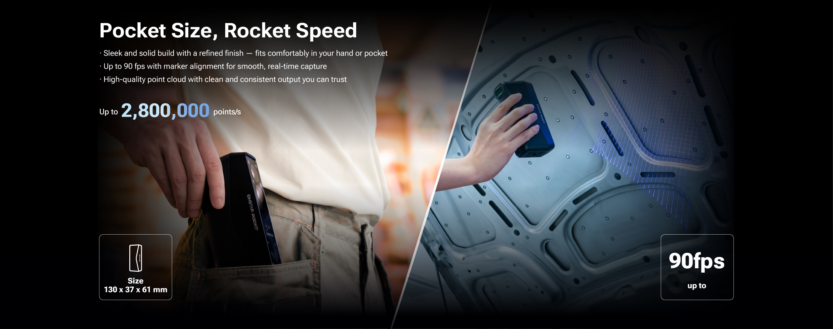 Rockit, boyutuna rağmen saniyede 90 kareye kadar veri yakalayarak gerçek zamanlı olarak temiz ve ayrıntılı nokta bulutları üretir. 38 lazer çizgisi ve optimize edilmiş derinlik performansıyla, karmaşık şekilleri verimli ve yüksek tutarlılıkla yakalayabilir.