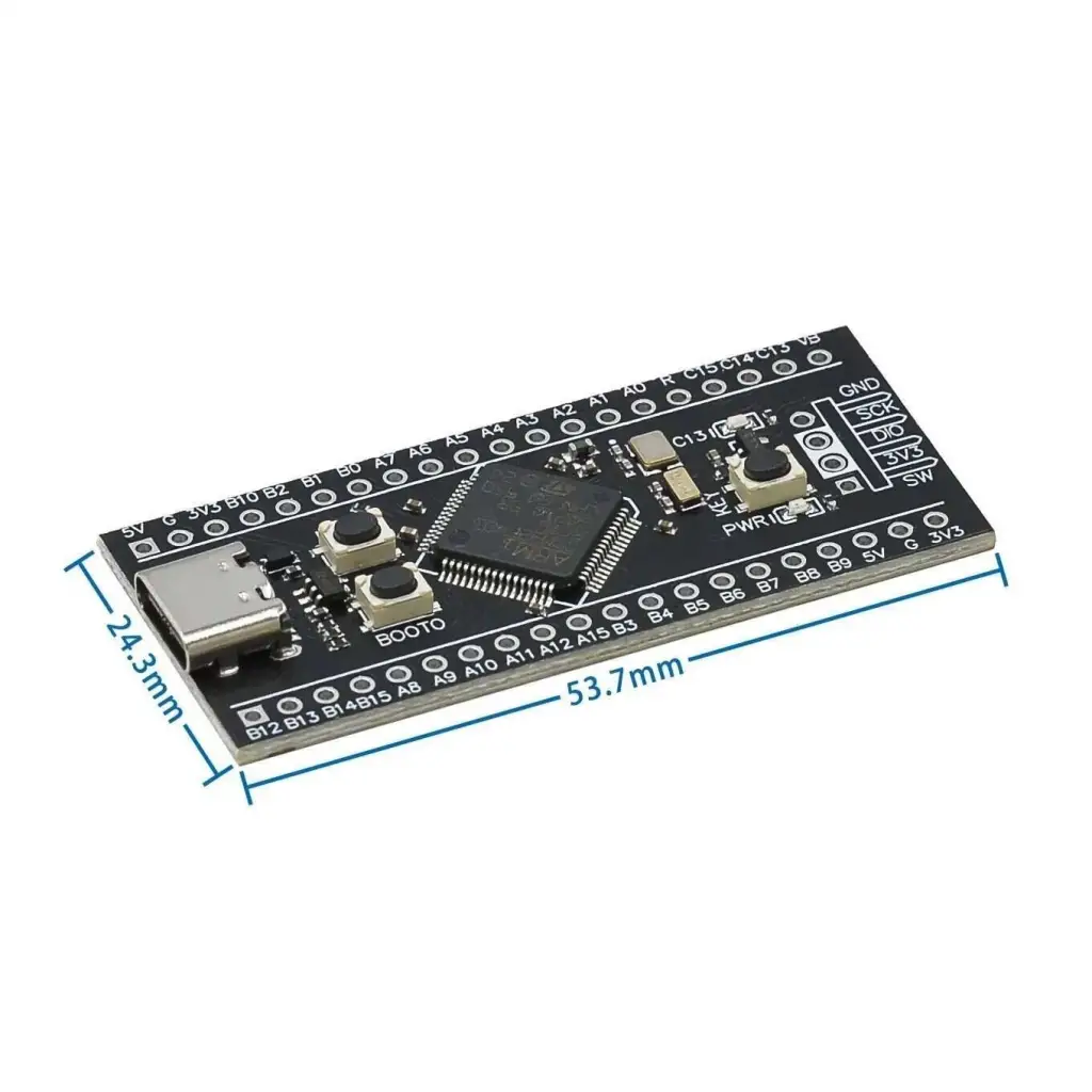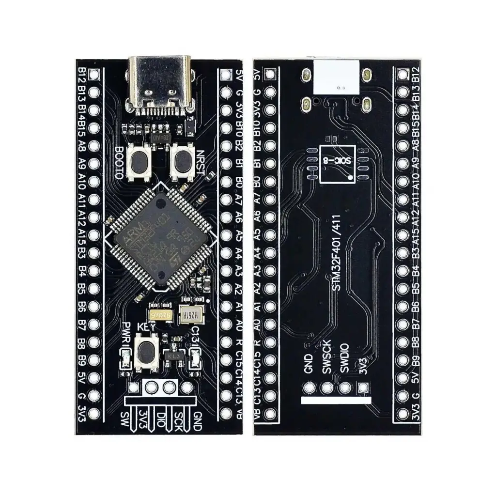 STM32F401 Black Pill Geliştirme Kartı, F103'ü temel alan popüler Blue Pill'in geliştirilmiş bir versiyonudur. Bu yeni model daha güçlü bir Core-M4F tabanlı ARM CPU'ya sahiptir. Cortex®-M4 çekirdeği, tüm Arm tek hassasiyetli veri işleme talimatlarını ve veri türlerini destekleyen bir tek hassasiyetli kayan nokta birimi (FPU) içerir. Ayrıca, uygulama güvenliğini artırmak için eksiksiz bir DSP talimatları seti ve bir bellek koruma birimi (MPU) içerir. STM32F401, yüksek hızlı gömülü belleklerin yanı sıra iki APB veri yoluna, iki AHB veri yoluna ve 32 bit çoklu AHB veri yolu matrisine bağlı çok çeşitli gelişmiş G / Ç ve çevre birimleri içerir.