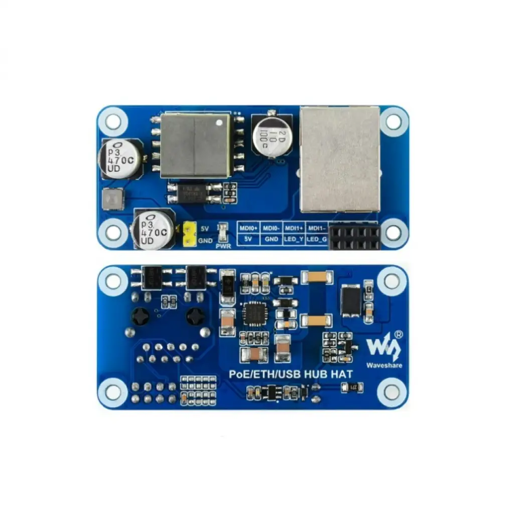 Waveshare PoE/ETH/USB HUB HAT, özellikle Raspberry Pi Zero serisi için tasarlanmış kompakt ve çok işlevli bir genişletme kartıdır. Tek bir modül üzerinde PoE güç beslemesi, Ethernet bağlantısı ve USB port genişletmesi sunarak projelerde kablolamayı ve donanım kullanımını büyük ölçüde kolaylaştırır.