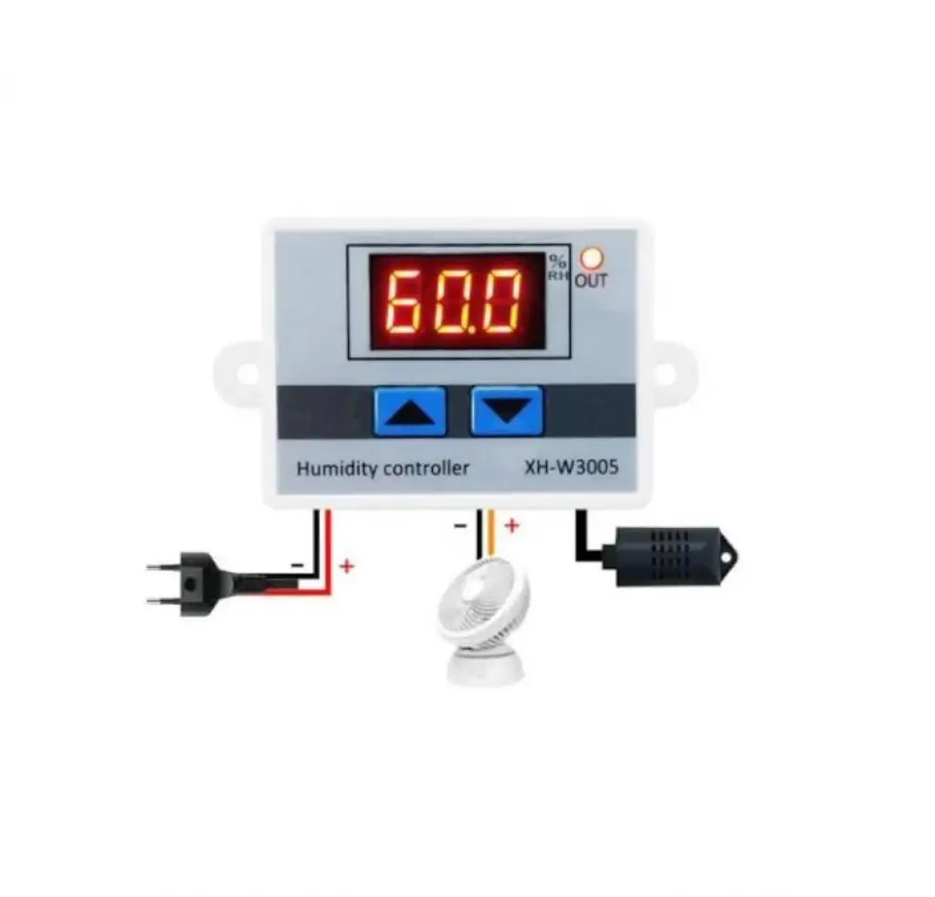 XH-W3005 AC 220V Röle çıkışlı, yüksek hassasiyete sahip bir dijital nem kontrol cihazıdır. 0,1 %RH yüksek nem kontrol hassasiyeti sunar. Nem kontrol aralığı 00%RH ile 99%RH arasındadır. Depo, oda, sera, kuluçka makinası vb. çeşitli yerlerdeki nemin kontrol edilmesi için kullanılır.