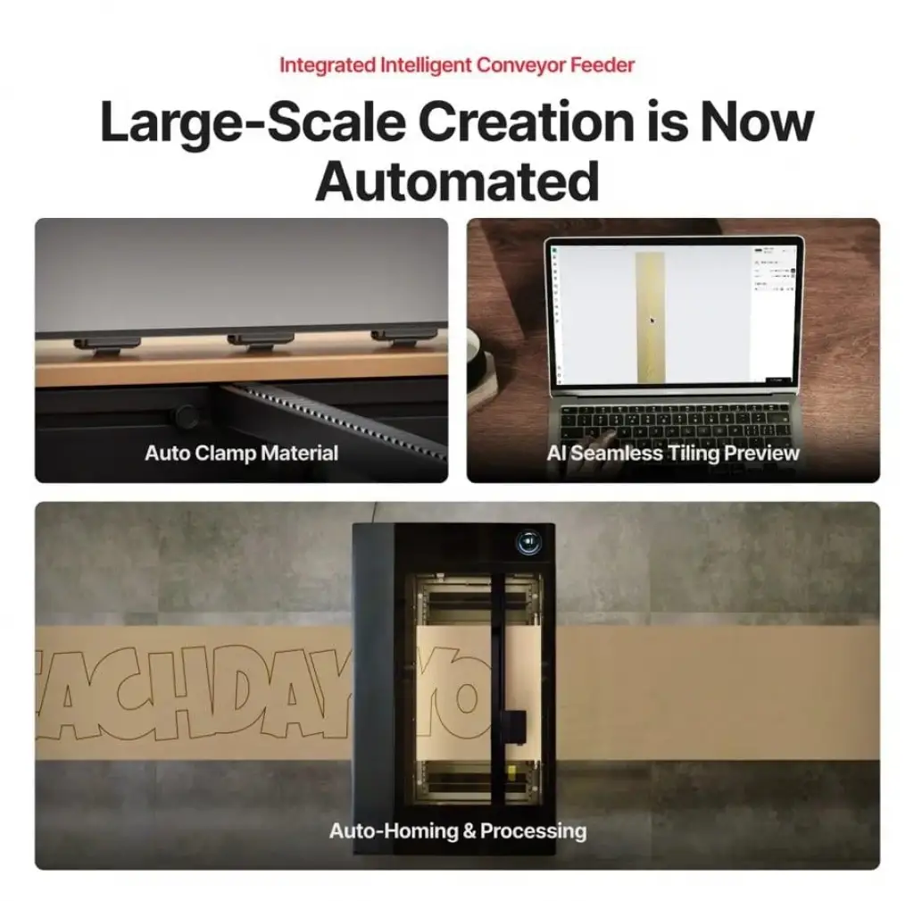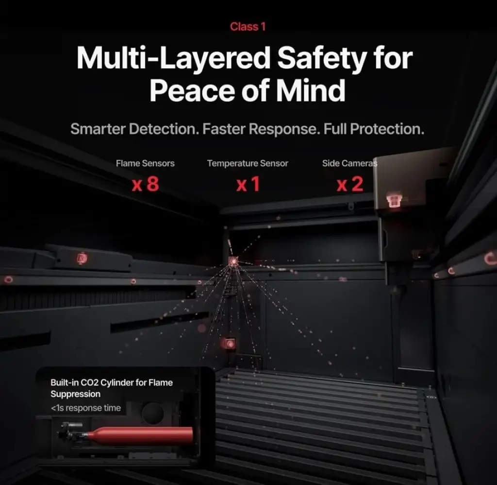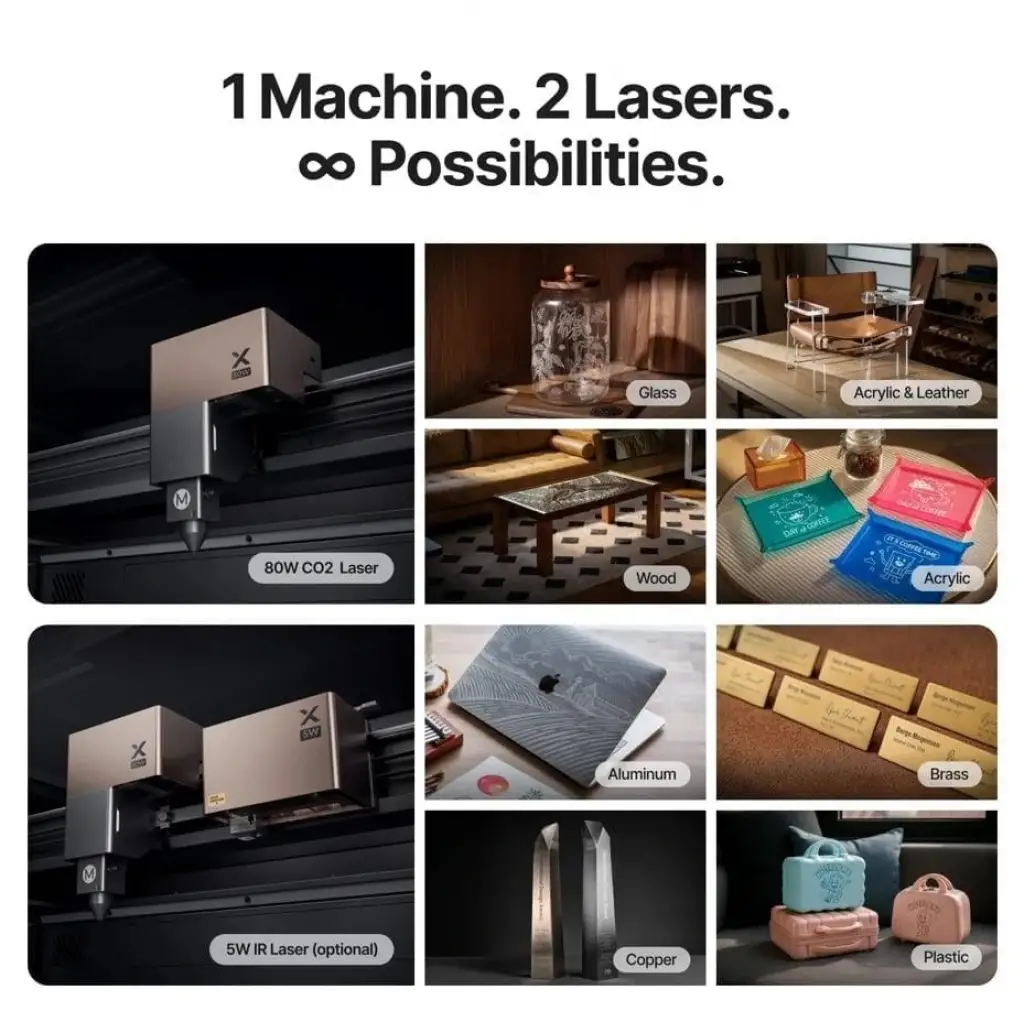 Çift lazer gücüyle 300'den fazla malzemeyi işleyin: kesim için güçlü 80 W CO2 lazer ve hassas metal kazıma için 5 W IR lazer. ( 5W IR lazer opsiyoneldir. Modüler sonradan takılan bir aksesuar olup Şubat 2026'dan sonra satışa çıkacaktır )