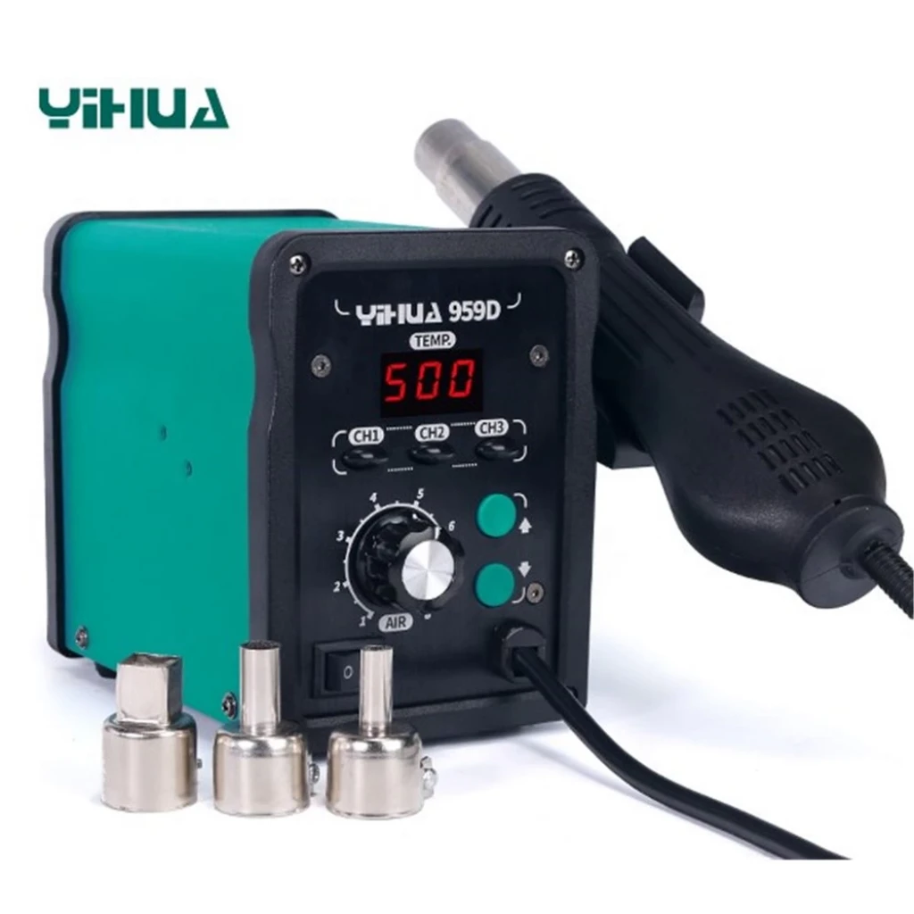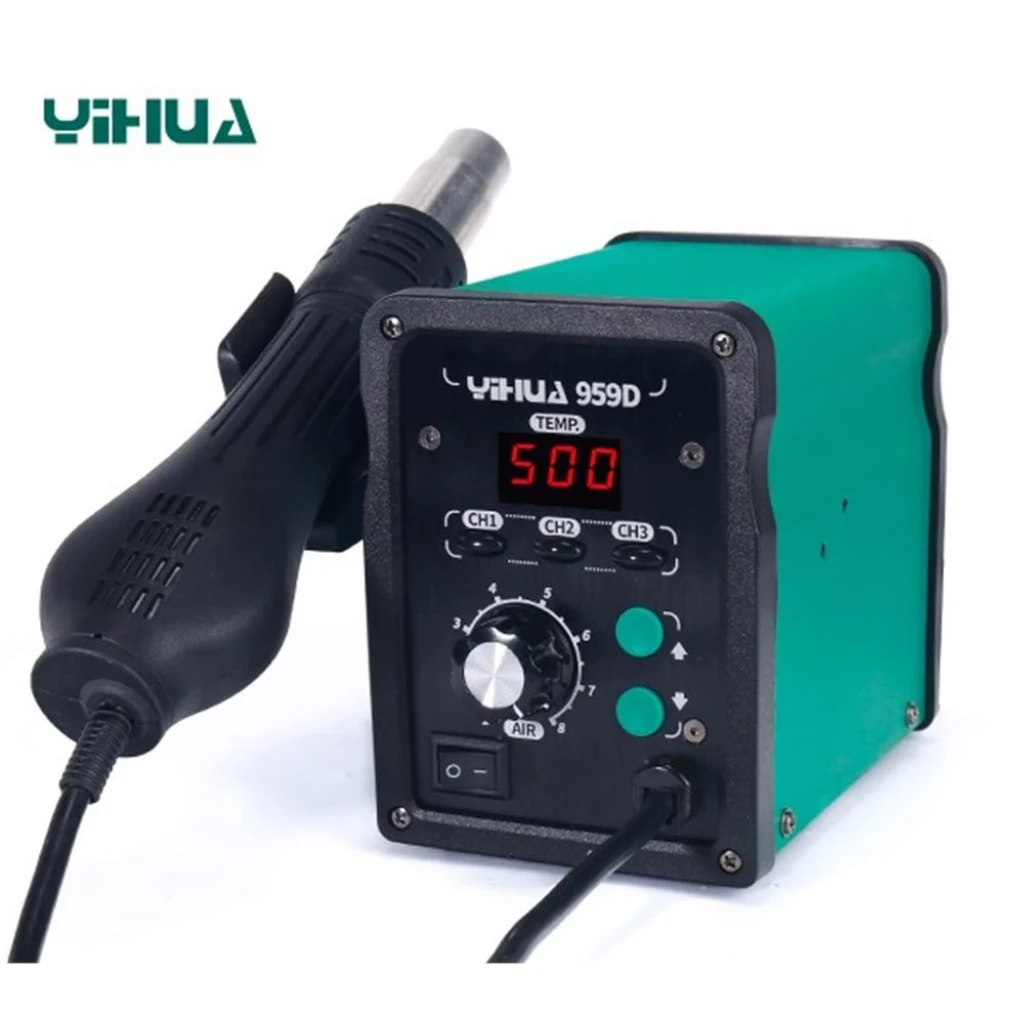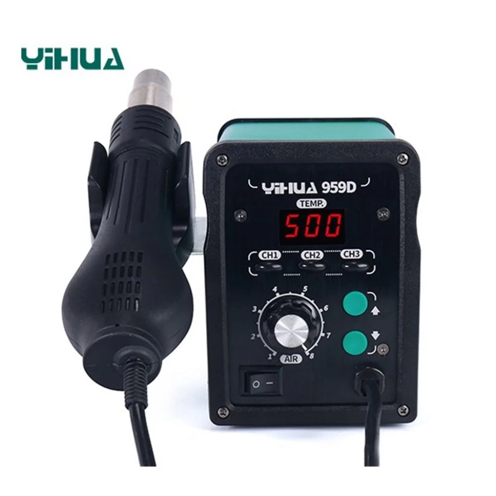 YIHUA-959D sıcak hava  istasyonu laboratuvarlar, okullar, elektronik üretim hatları, cep telefonu tamir endüstrisi ve ev aletleri bakım departmanı gibi birçok alanda yaygın olarak bulunur. SMD bileşenleri, çok pinli IC ve devre kartı bileşenlerini lehimlemek için kullanabilirsiniz.